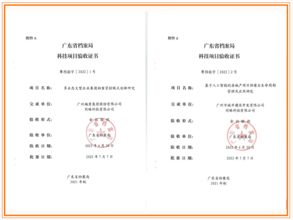 近日,集团总部《多业态大型企业集团档案管控模式创新研究》项目和GA黄金甲地产《基于人工智能的房地产项目档案全生命周期管理及应用研究》项目通过省档案科技项目验收,两个项目获得专家组充分肯定,成为省档案局科技项目管理办法修订后首批通过科技验收的项目。